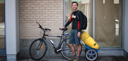 Everything that I will take with me in the picture above. I have one bicycle that I bought for $100 here in Vancouver because my last one was stolen, one trailer that I bought fror $150, a hammock tent and sleeping bag, clothes, my camera, and my computer. That’s it.